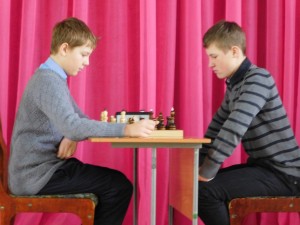 В группе мальчиков старше 10 лет победил Рома Федотов из детско-юношеского центра, набравший 9 очков из 11. Второе место с 8,5 очками занял Денис Беин из Мамонтовской школы, а на третьей строчке расположился Костя Крупский из детско-юношеского центра – у него 7.5 очков. На фото внизу можно увидеть, как Рома Федотов и Денис Беин играют решающую партию.