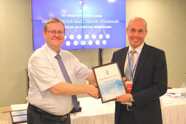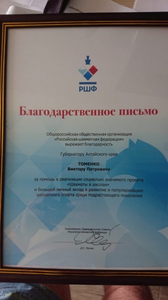 В Дагомысе 2 июня состоялся внеочередной съезд шахматистов России. На нем были названы и награждены регионы, которые наиболее активно и эффективно реализуют образовательную программу «Шахматы в школе». В их числе оказался Алтайский край. Благодарственное письмо РШФ на имя губернатора Виктора Томенко вручено президенту федерации Артему Поломошнову. В настоящее время в проекте «Шахматы в школе» принимают участие 155 учебных учреждения края из 42 муниципалитетов. Интерес к программе только растет.