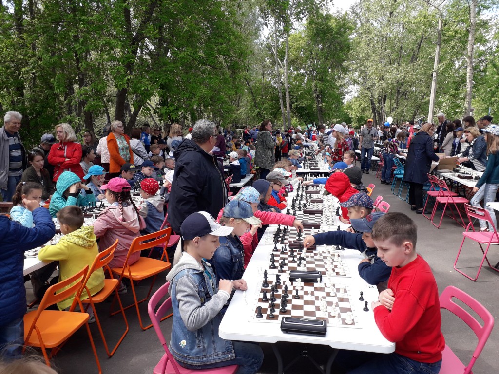 головой, стояла хорошая, теплая погода. Для проведения шахматного турнира под открытым небом это очень важно. Буквально за пару часов в парке была раскинута площадка для игры на 200 посадочных мест и организован судейский кабинет.