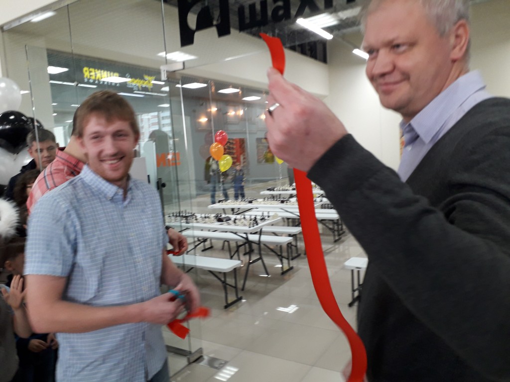 Символическую красную ленточку перерезали почетные гости праздника – вице-президент федерации шахмат Алтайского края, председатель Тренерского совета Максим Герасимюк и представители компании-партнера «Красный Кит», директор Николай Александрович Богданов и его заместитель Евгений Николаевич Азаров. На торжественной линейке состоялась церемония приема в ученики академии, новичкам повязали фирменные синие галстуки с логотипом нашей организации.