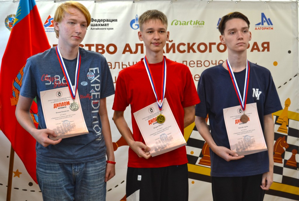 Понадобился тай-брейк и юношам в категории до 15 лет. Только здесь борьба шла за бронзовую медаль, а претендовали на неё трое участников: барнаулец Матвей Яблоков, бийчане Андрей Журавлёв и Артемий Мишин, набравшие по 3 очка из 6. Ребята в круг играли дополнительные партии друг с другом, и тай-брейк завершился успехом для Артемия Мишина. Он разделил пьедестал вместе двумя представителями Барнаула: серебро взял Андрей Осадчий (5 очков), золото выиграл Артём Наземцев (6 очков).