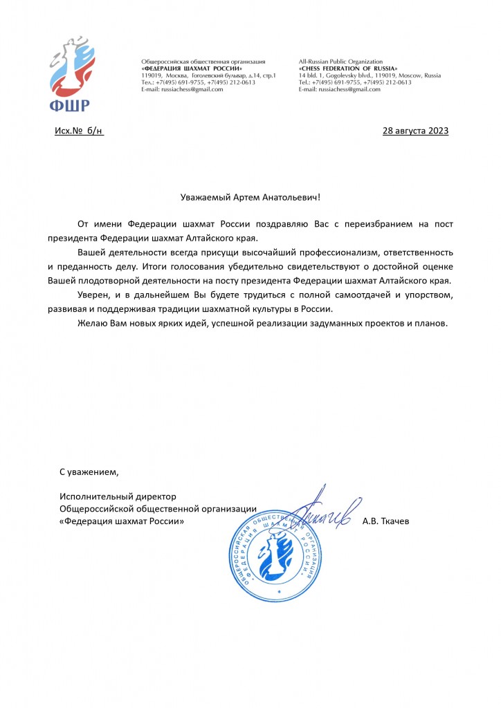 Поздравительное письмо направил исполнительный директор Федерации шахмат России Александр Ткачёв.