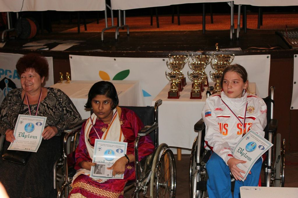 Дебютантка этого же чемпионата мира по шахматам среди лиц с поражением опорно-двигательного аппарата Ольга Дьячина, учащаяся краевой школы-интерната 6 вида, заняла 3 место среди женщин–колясочниц, пропустив вперед опытных спортсменок – неоднократную чемпионку мира среди женщин с ПОДА Жиниту Анто (Индия) и члена сборной команды IPCA (лиц с ПОДА) на Всемирных шахматных олимпиадах в Ханты-Мансийске и Стамбуле Елену Курочкину (Россия). В первенстве мира среди девушек Дьячина заняла 2 место, а чемпионкой среди юниорок стала второй год подряд Никола Конколова (Словакия).
