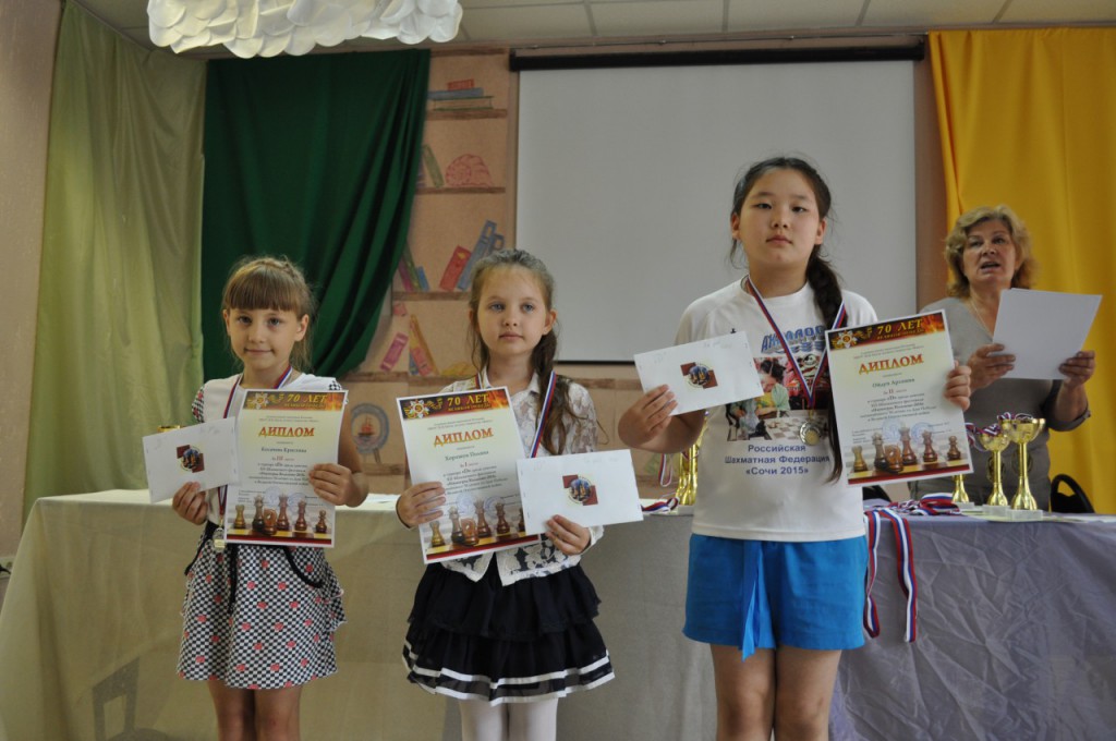У девочек чемпионкой стала юная спортсменка из Новосибирска Полина Хорошун (тренер В.Малышев), «серебро» завоевала Арсения Ойдуп (тренер А. Ойдуп) из Республики Тыва, а бронзовую медаль получила наша спортсменка Кристина Косачева (тренер Александр Казанцев). Кристина удачно стартовала, набрав 5 очков из 6 возможных, уверено лидировала, но пробоины, полученные в 7 и 8 турах отодвинули ее назад. Стоит отметить также игру других наших девочек Падалкиной Наташи (тренер Татьяна Цепенникова) и Яны Кондрашовой (тренер Сергей Якимов), набравших по 5,5 очков.