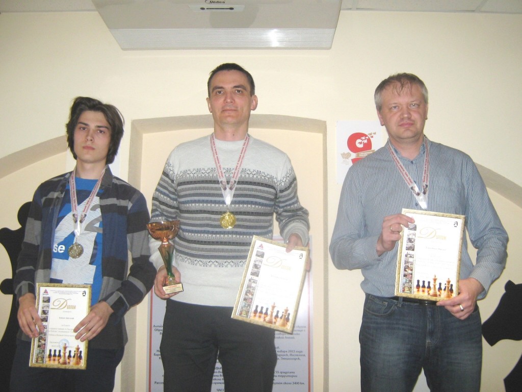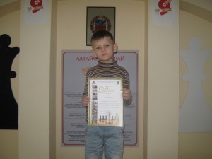 Лучший результат среди ветеранов показал Иван Сусляков – 6 из 9. Первое место в зачете школьников занял Михаил Коваленко – 5,5 из 9. Он, кстати, в третьем туре в партии с Герасимюком уверенно продержался черными в обороне, а затем, воспользовавшись грубым зевком противника, объявил мат. Лучший результат среди женщин показала Ольга Нестерова из Новоалтайска. Специальным дипломом был отмечен и самый юный участник соревнований – 7-летний Роман Гольцев. Во время церемонии награждения Рома сраду взобрался на верхнюю ступень пьедестала – молодец!