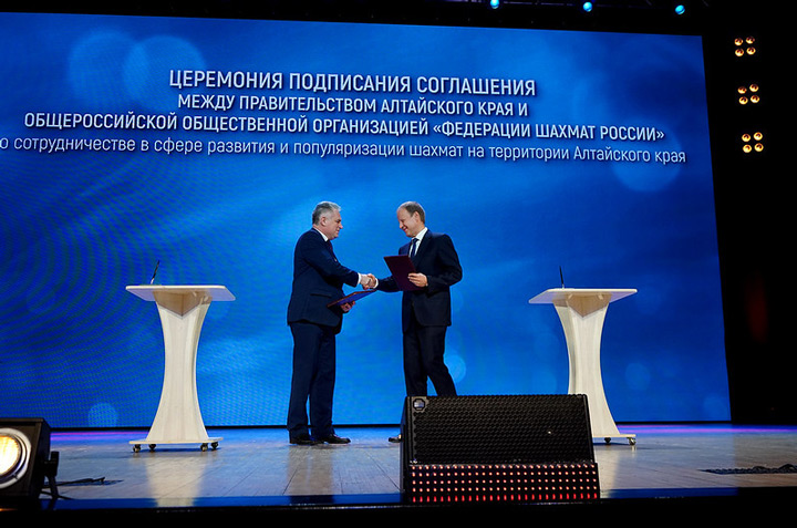 На церемонии открытия было подписано соглашение между Правительством Алтайского края и Федерацией шахмат России о сотрудничестве в сфере развития и популяризации шахмат на территории региона. Свои подписи под документом поставили губернатор Алтайского края Виктор Томенко и исполнительный директор ФШР Александр Ткачёв.