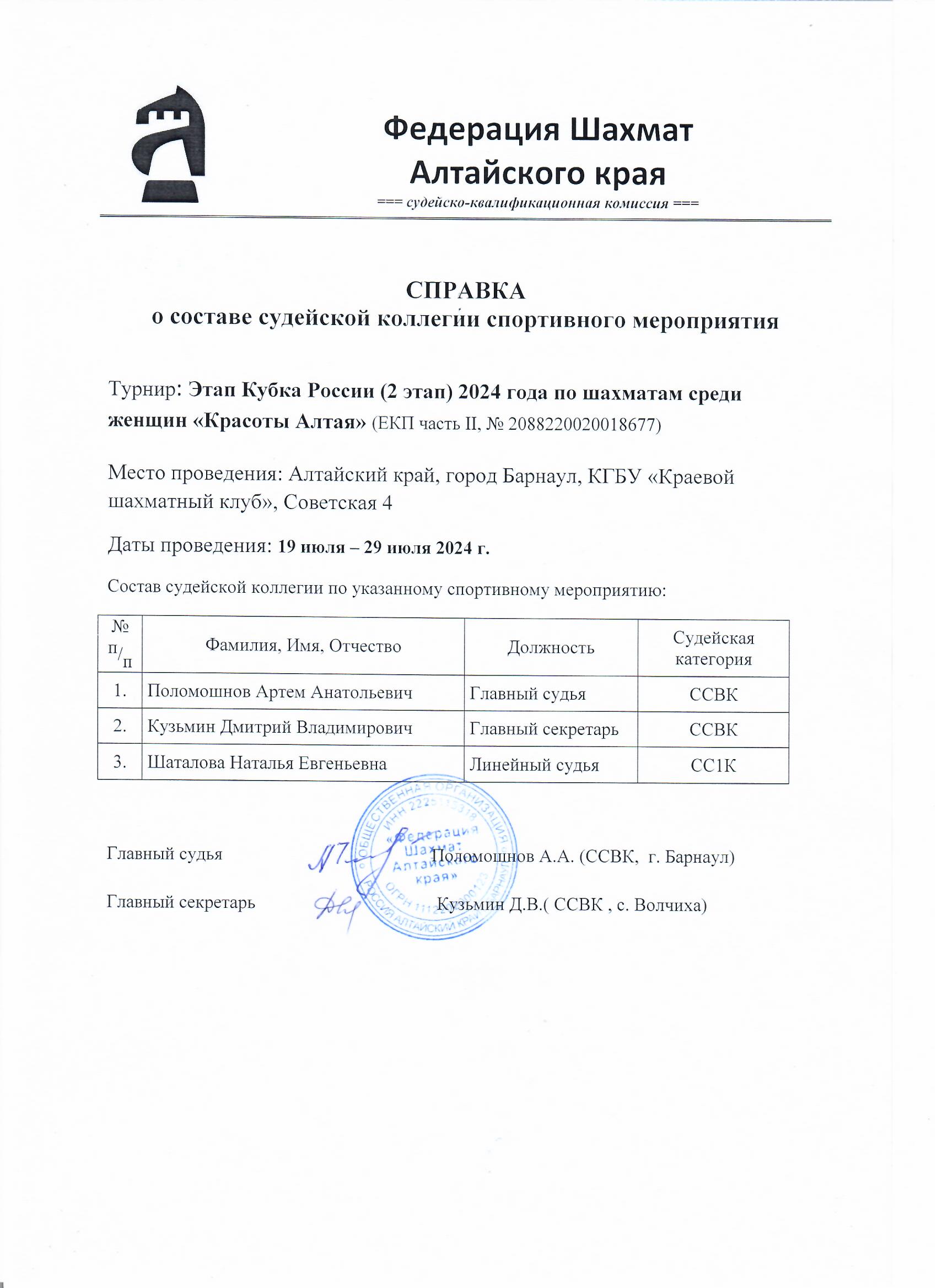 Оргкомитет: директор соревнований и председатель комиссии по допуску - Поломошнов Артём Анатольевич, главный судья - Кузьмин Дмитрий Владимирович, спортивный судья всероссийской категории.