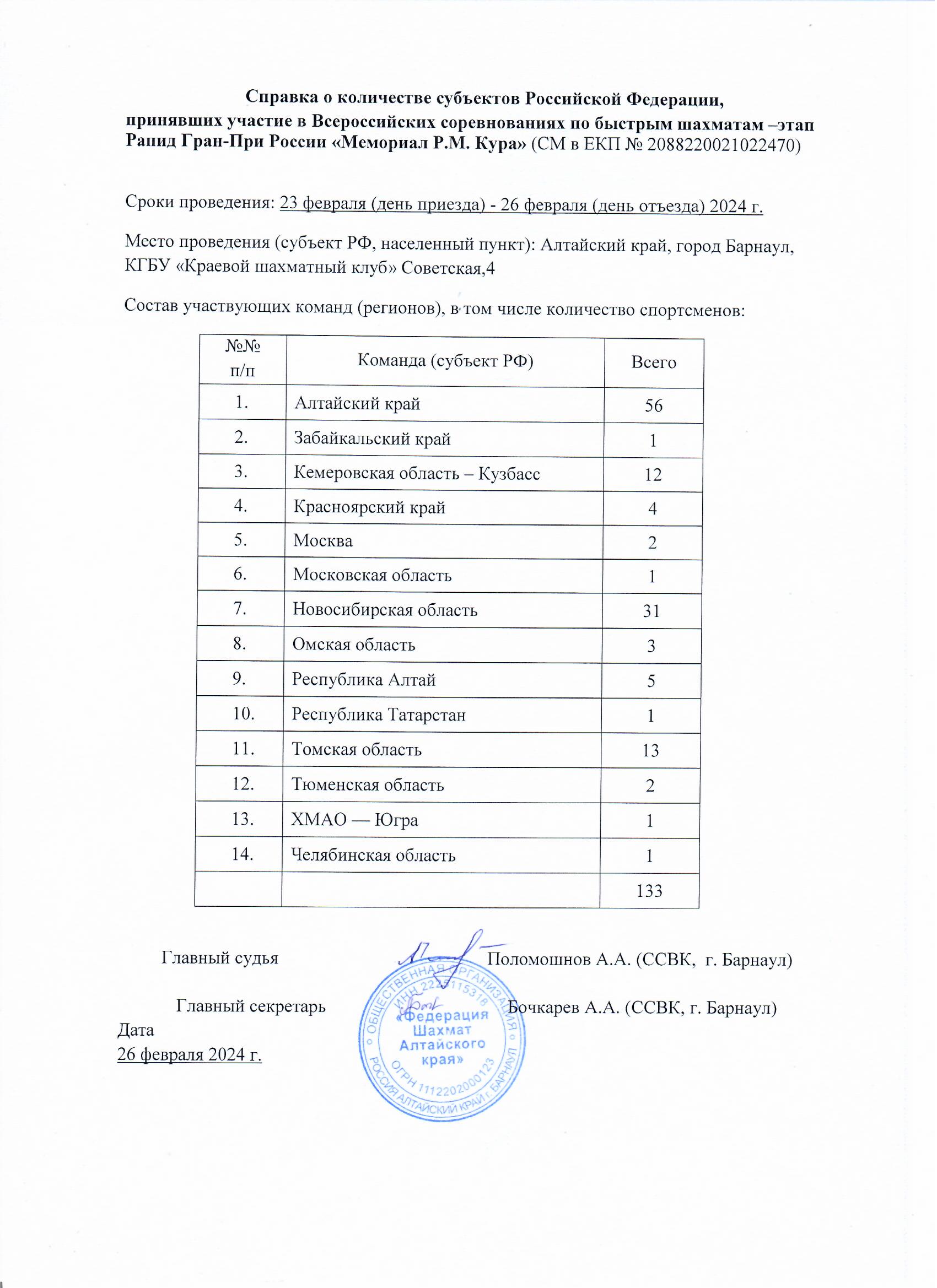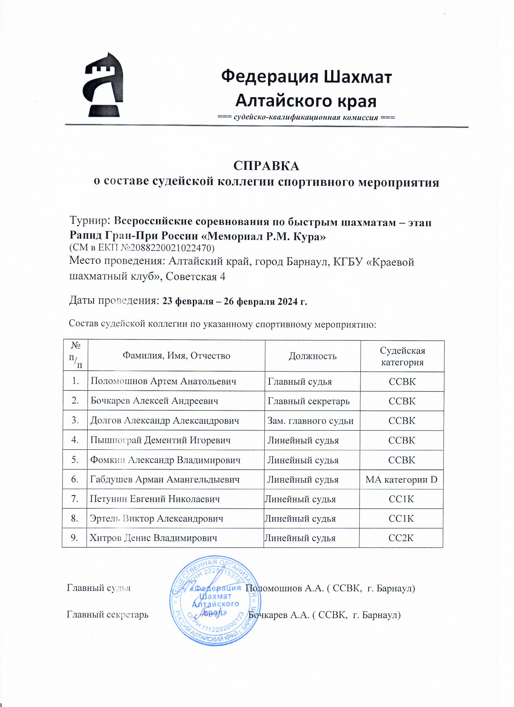 Оргкомитет: директор соревнований и председатель комиссии по допуску - Косачёв Дмитрий Юрьевич (Алтайский край), главный судья - арбитр ФИДЕ, судья всероссийской категории Поломошнов Артём Анатольевич (Алтайский край).